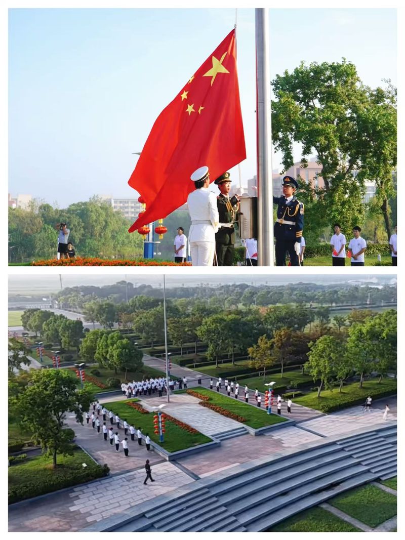 校国旗护卫队队员身着制服,迈着铿锵有力的步伐护送五星红旗至升旗台,每一步都饱含着祝福和礼赞。在雄壮的国歌声中,全体师生肃立行礼,注视着国旗冉冉升起。鲜红的国旗在晨光中猎猎飘扬,与师生手中挥舞的小国旗交相辉映,定格成校园里最动人的爱国图景。