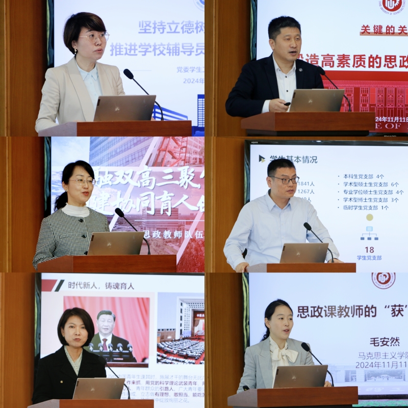 座谈会上,学工部部长崔姗姗、马院党委书记王爱祥分别就辅导员队伍建设、思政课教师队伍建设情况进行了专题汇报。化工学院党委副书记高艺霞、商学院党委副书记蒋志强、体育学院党委副书记吴婷、马克思主义基本原理教研室主任毛安然就思政队伍建设和思政课教学工作进行了交流汇报。与会代表就配齐建强思政教师队伍、“大思政”格局建设、高质量思政育人等方面进行了深入交流。